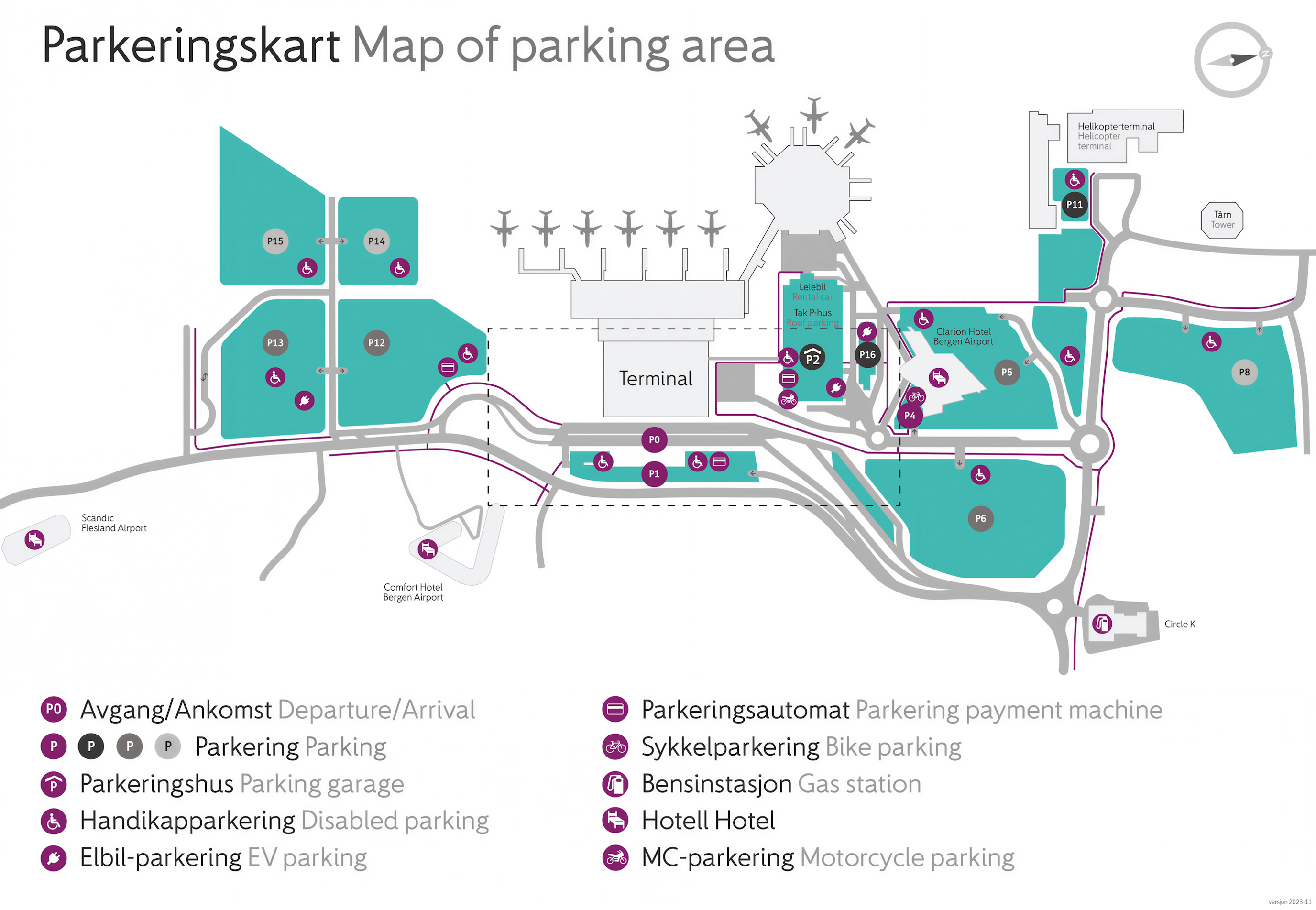 - P2 Parkeringshus: 8 plasser. 1. etasje er i umiddelbar nærhet til gangvei til terminalen. Maks høyde på kjøretøy i p-hus er 2,1 meter.