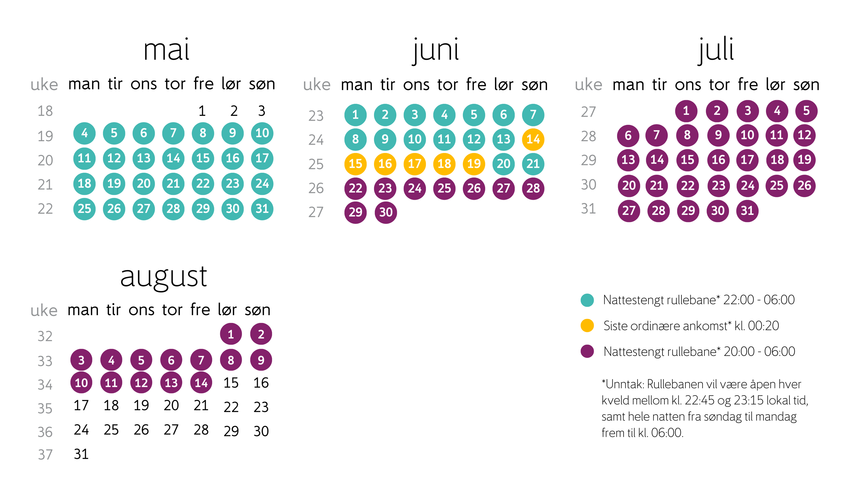 I denne perioden vil rullebanen være stengt om natten, mens flytrafikken på dagtid i stor grad vil gå som normalt. Flyselskapene er informert, og flyprogrammet er tilpasset arbeidene.