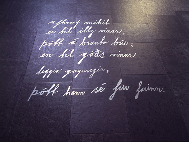 "35 gange skal du, gjest ei vere alltid på eiom stad. Ljuv vert lei som lenge sit kyrr på sonans krakk" (håvamål oversatt til engelsk).